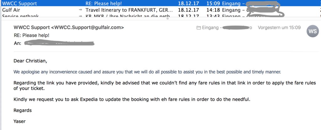 Zur selben Zeit korrespondierte ich mit Gulfair. Ich hatte GF einen Link mit den Tarifbestimmungen gemailt, die uns Expedia schickte, als Tarifbestimmungen für diesen Flug. Der GF WWCC Support Mitarbeiter Yaser konnte damit nichts anfangen: „Regarding the link you have provided, kindly be advised that we couldn’t find any fare rules in that link in order to apply the fare rules of your ticket.“ Die „Fair Rules“, die mir Expedia zusammen mit den Tickets schickte.