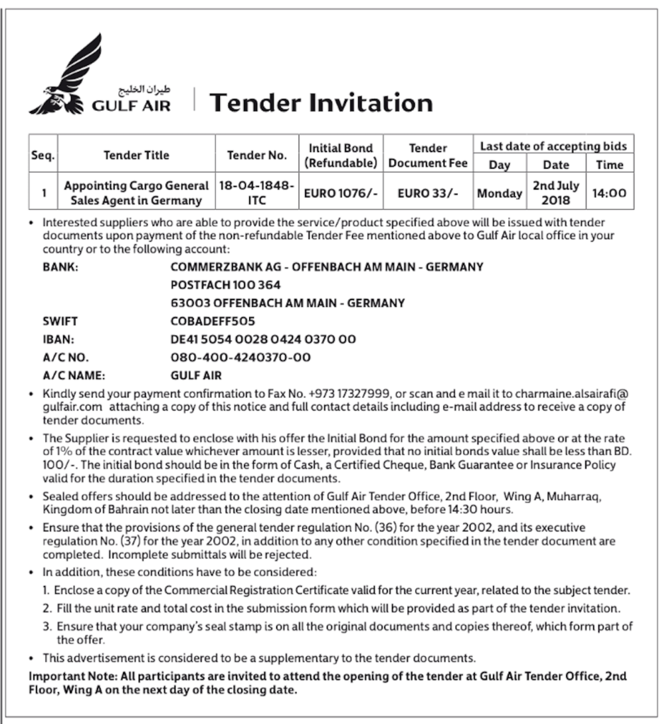 Gulf Air Tender – Cargo Sales Agent Gulf Air Tender - Cargo Sales Agent Gulf Air Tender – Cargo Sales Agent